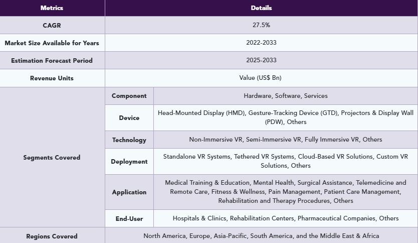 新たなトレンドとしては、即時遠隔診断のためのVRと人工知能および5Gの融合、没入型トレーニングおよび患者エンゲージメントのためのヘッドマウントディスプレイ(HMD)の広範な採用、メンタルヘルス、疼痛管理、PTSDや恐怖症などの疾患に対する暴露療法へのVRの拡張などがあります。