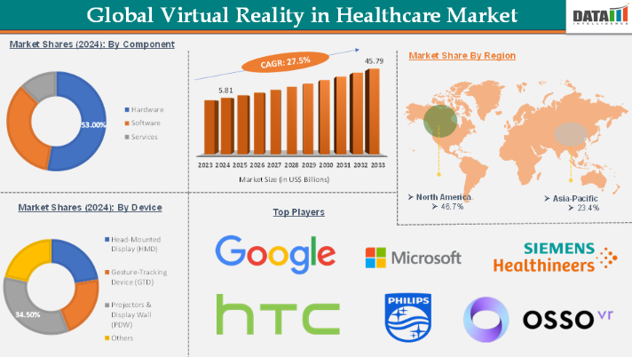 ヘルスケアにおけるバーチャルリアリティの世界市場は、2024年に58億1000万米ドルに達し、2033年には457億9000万米ドルに達すると予測され、2025年から2033年の予測期間中にCAGR 27.5%で成長する見込みです。