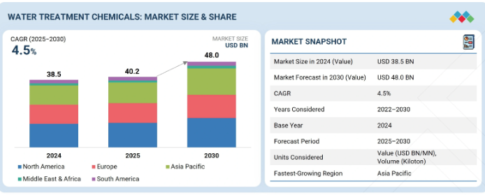 予測期間中、水処理薬品市場は、2025年の402億米ドルから2030年には480億米ドルに達し、年平均成長率(CAGR)は4.5%になると見込まれています。水処理薬品市場の成長は、都市化と工業化の進展に加え、効果的な排水管理を求める環境規制の強化によって牽引されています。水不足や汚染の深刻化に伴い、水処理プラントへの投資が増加しており、膜処理技術、殺菌剤、腐食防止剤が市場の成長を後押ししています。