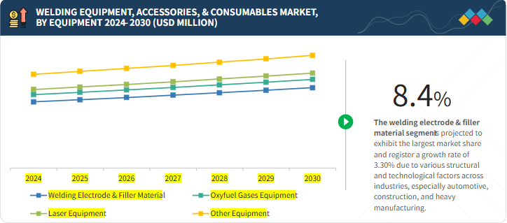 溶接機器・アクセサリー・消耗品市場は、タイプ別に電極・溶加材機器、酸素ガス機器、その他機器に区分されます。電極・溶加材機器は、重工業や建設業を含む複数の用途分野で幅広い需要があることから、最大の市場シェアを占めています。