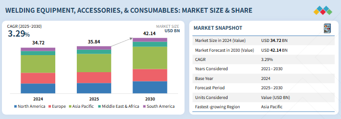 溶接機器、付属品、消耗品市場は、2025年の258.4億米ドルから2030年には421.4億米ドルに達すると予測され、2025年から2030年までの年平均成長率は3.29%です。溶接機器、付属品、消耗品の需要は、様々な要因により拡大する見込み。鉄鋼用途の拡大、自動車の技術革新、EVの成長、精度と効率を向上させる溶接技術の進歩、その他の最終用途産業からの需要の増加などが市場を牽引すると考えられます。