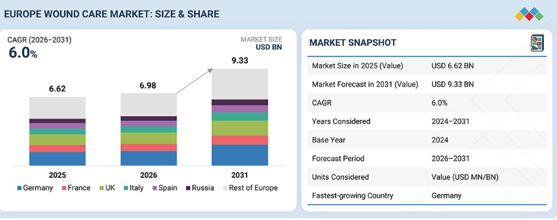 欧州創傷ケア市場は、2025年に66億2000万米ドルと評価され、2026年には69億8000万米ドルに達した。2026年から2031年にかけて堅調な年平均成長率(CAGR)6.0%で拡大し、期間末までに93億3000万米ドルに達すると予測されている。欧州全域での成長の勢いは、先進的な創傷ケア技術の欧州医療インフラへの統合、早期診断の重視、慢性・急性創傷向け創傷ケア製品の開発によって推進されている。さらに、欧州医療インフラへの投資、品質への注力、公的医療機関とメーカー間の連携も、この市場の成長を後押ししている。