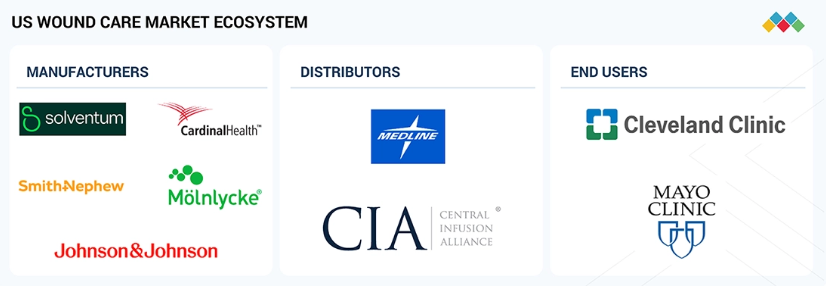 米国創傷ケア市場のエコシステムマップは、メーカー、流通業者、医療機関、開発提携組織などの主要ステークホルダーが連携し、創傷管理の効率化と患者ケアの最適化を図る相互接続構造である。高度な創傷ケア製品の開発を通じたイノベーションが改善ニーズに応えるため、メーカーの役割は明らかである。さらに、流通業者、物流プロバイダー、共同購買組織の機能も重要であり、製品のタイムリーな供給と市場アクセス促進を担う。さらに、病院、外来手術センター、在宅医療施設は、回復の迅速化、感染予防、患者快適性の向上を目的に創傷ケアソリューションを選択するエンドユーザーを代表する。